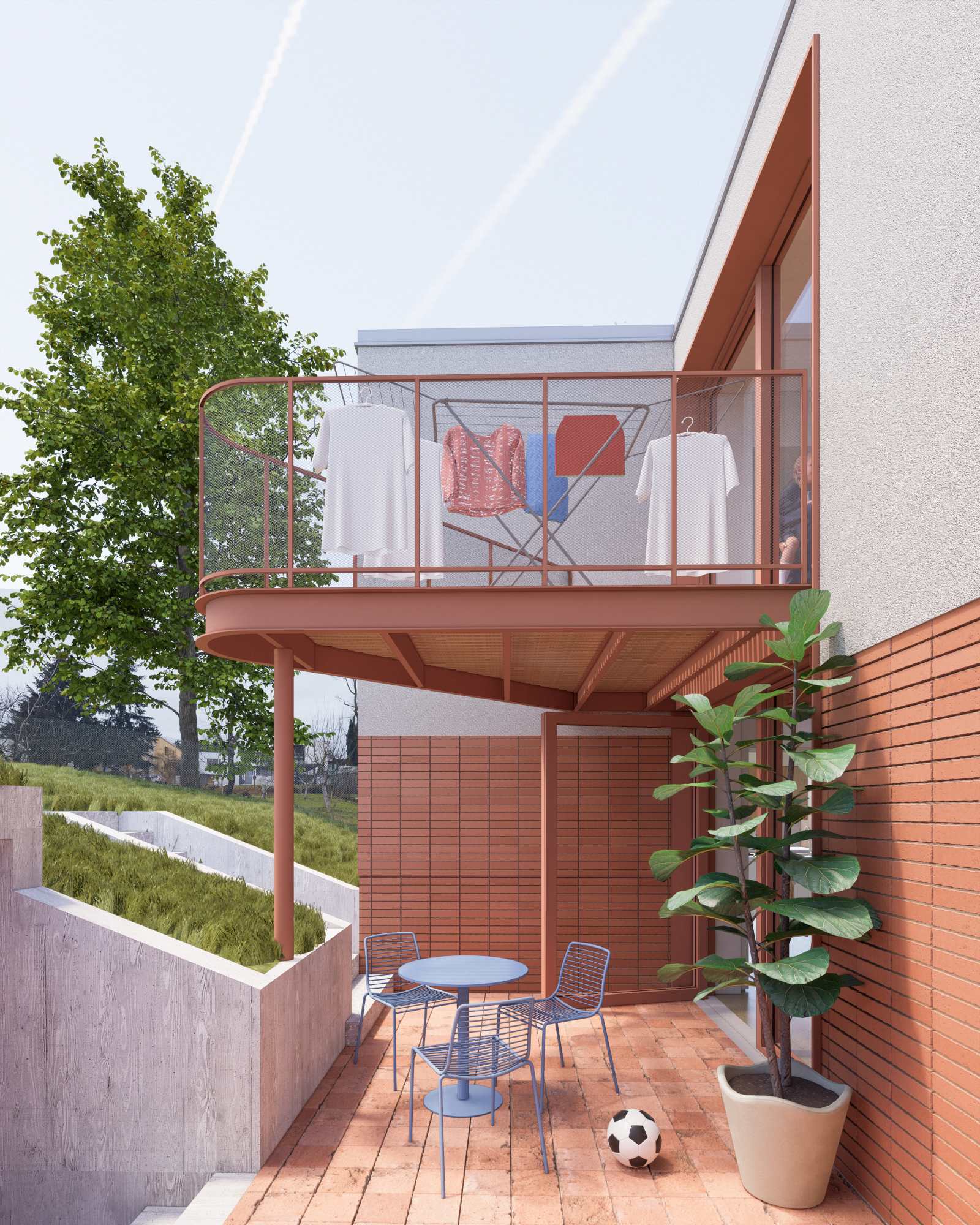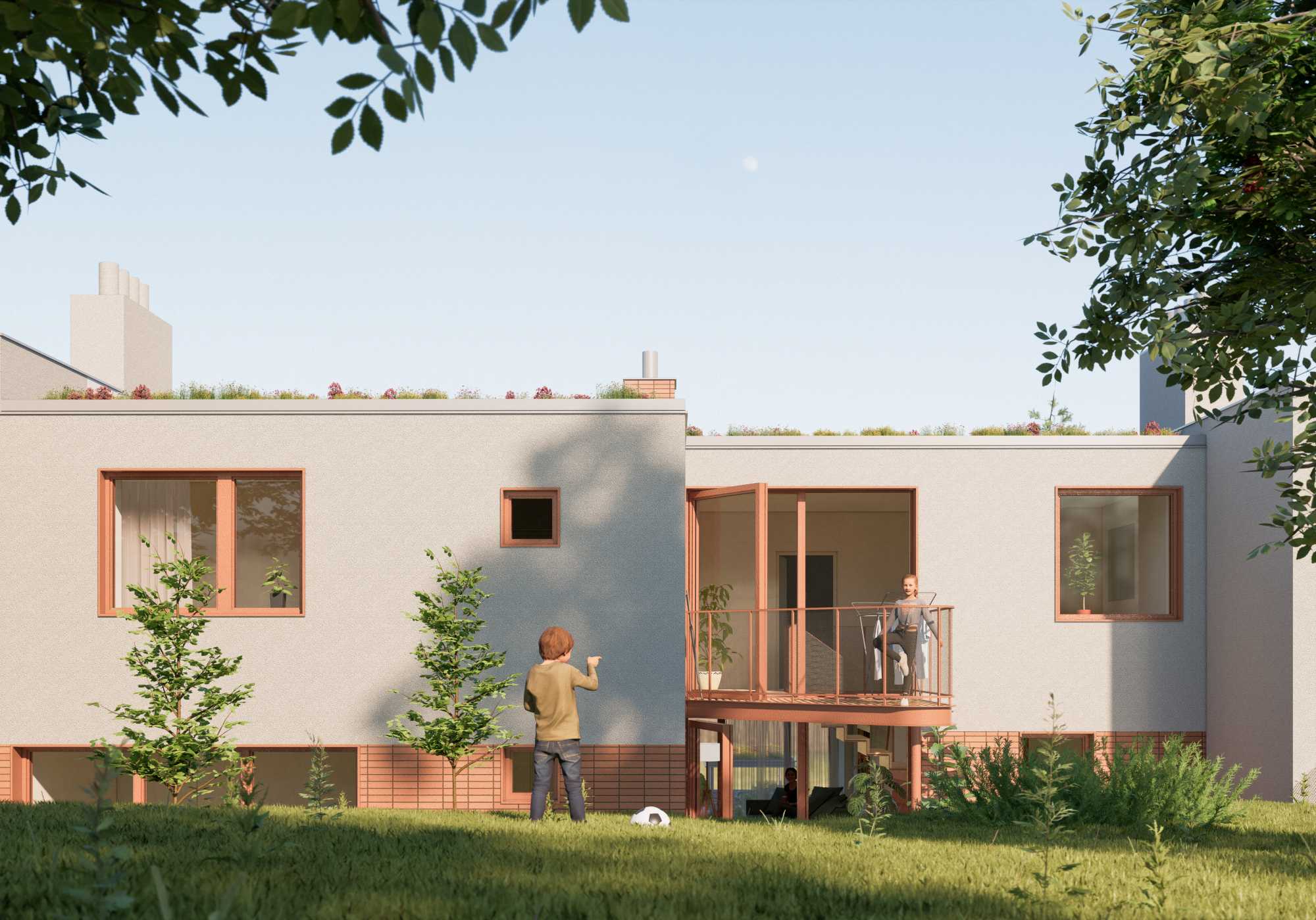 Exteriér domu vychádza z pôvodných materiálov a kombinuje klasickú omietku s keramickým „kabrincovým“ obkladom. Výrazový oranžový akcent obkladu sa premietol aj do farby okien a kovových prvkov. Autorským vkladom sa v skromnej architektúre stáva nový oceľový balkón orientovaný do dvora, ktorý nahrádza staticky poškodenú loggiu.